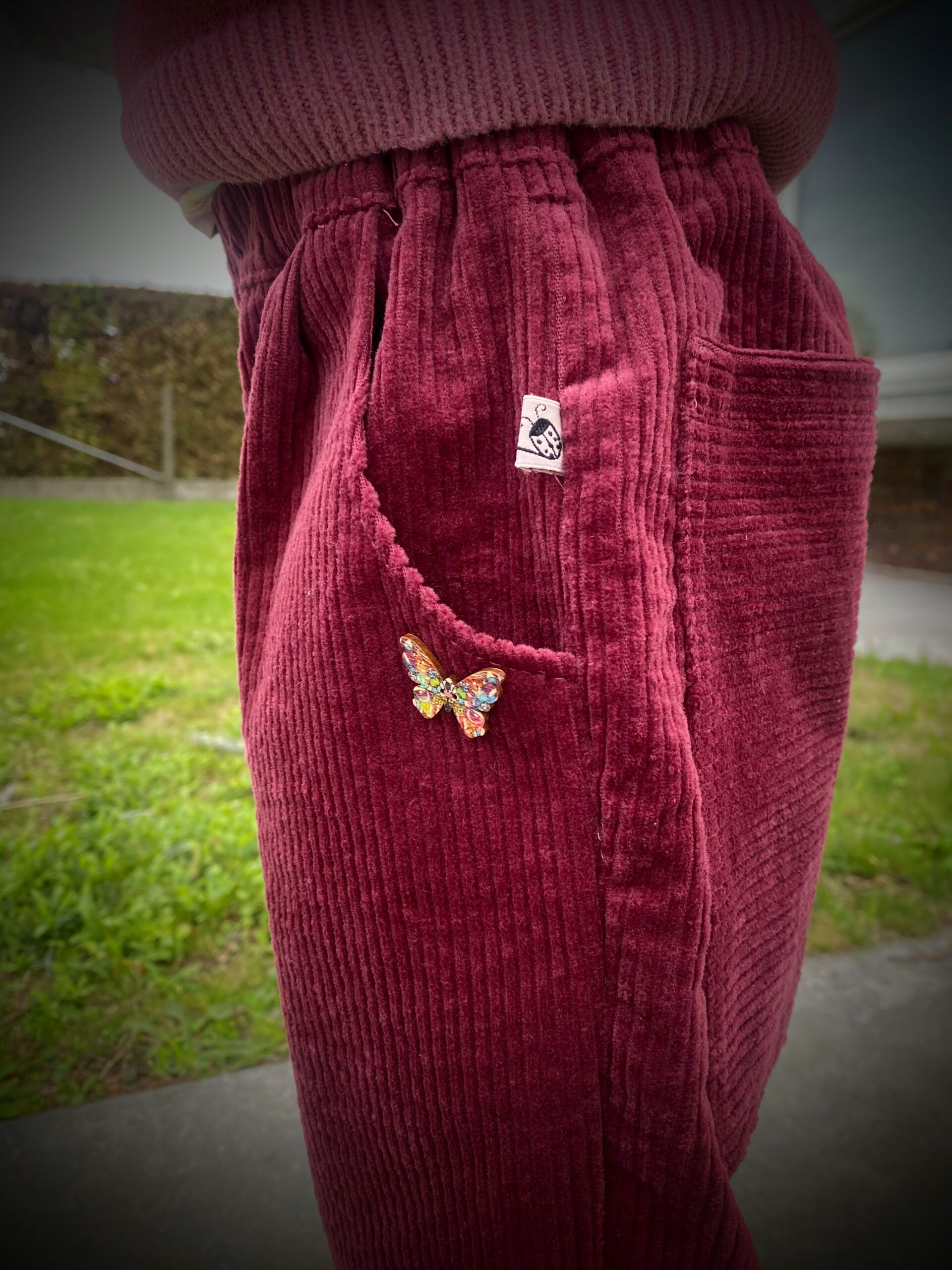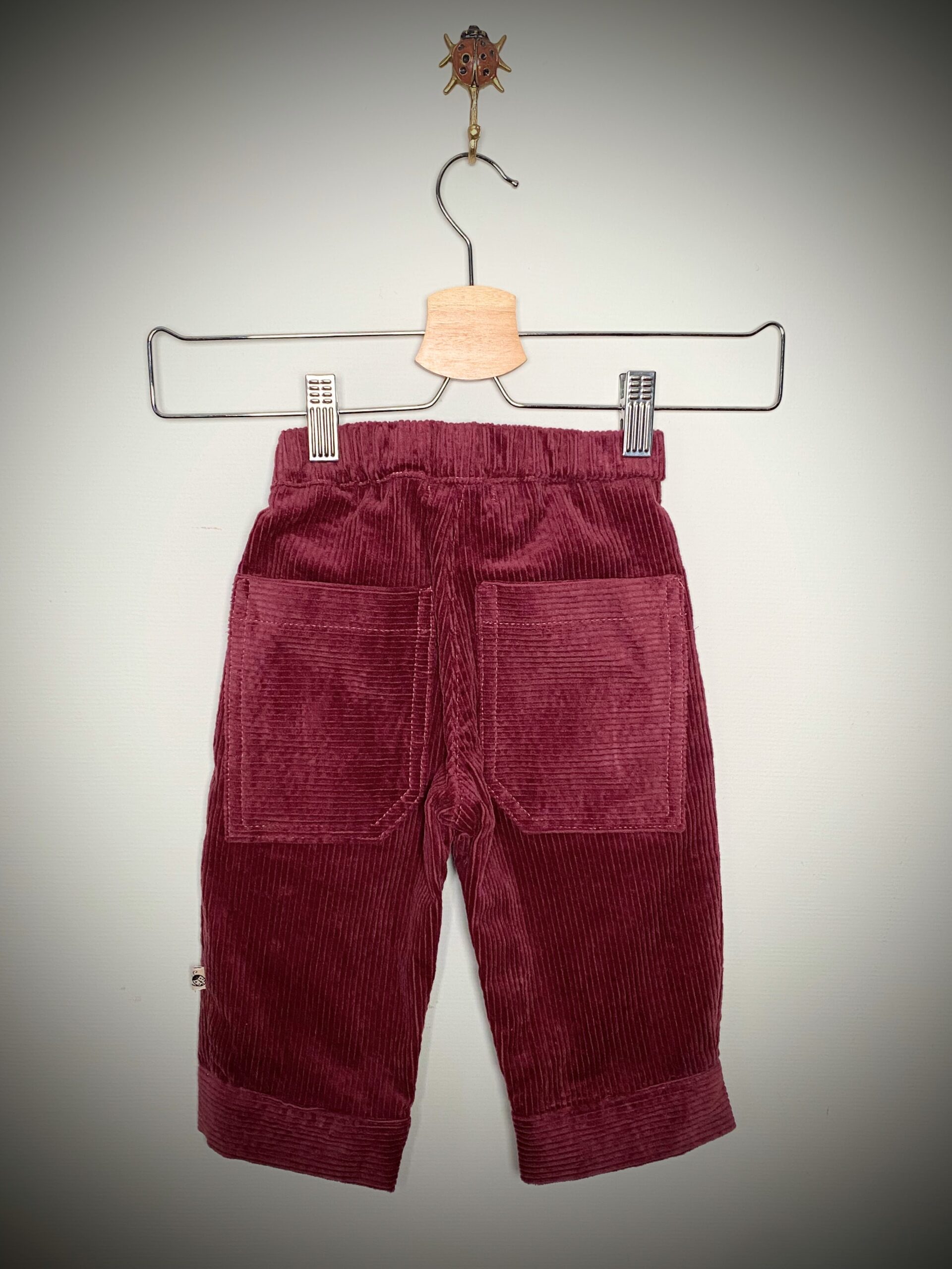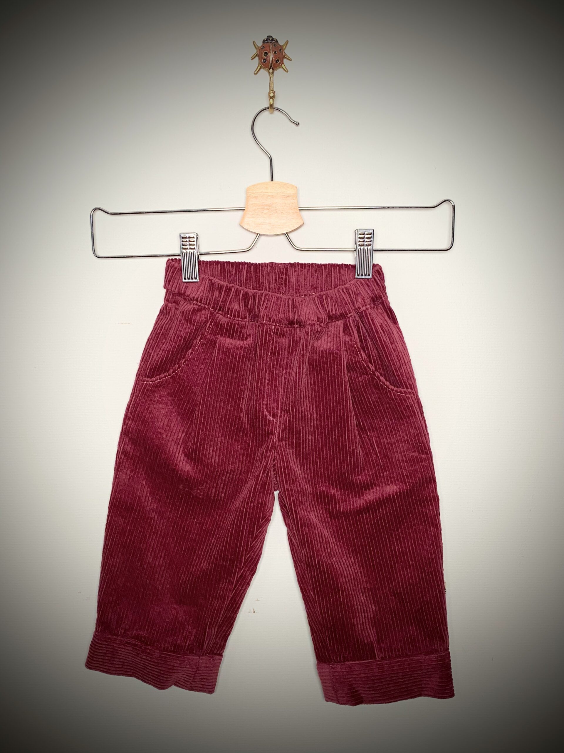 Handgemaakt bijna-lang broekje in zacht katoenen ribfluweel, in een warme bessenkleur.
