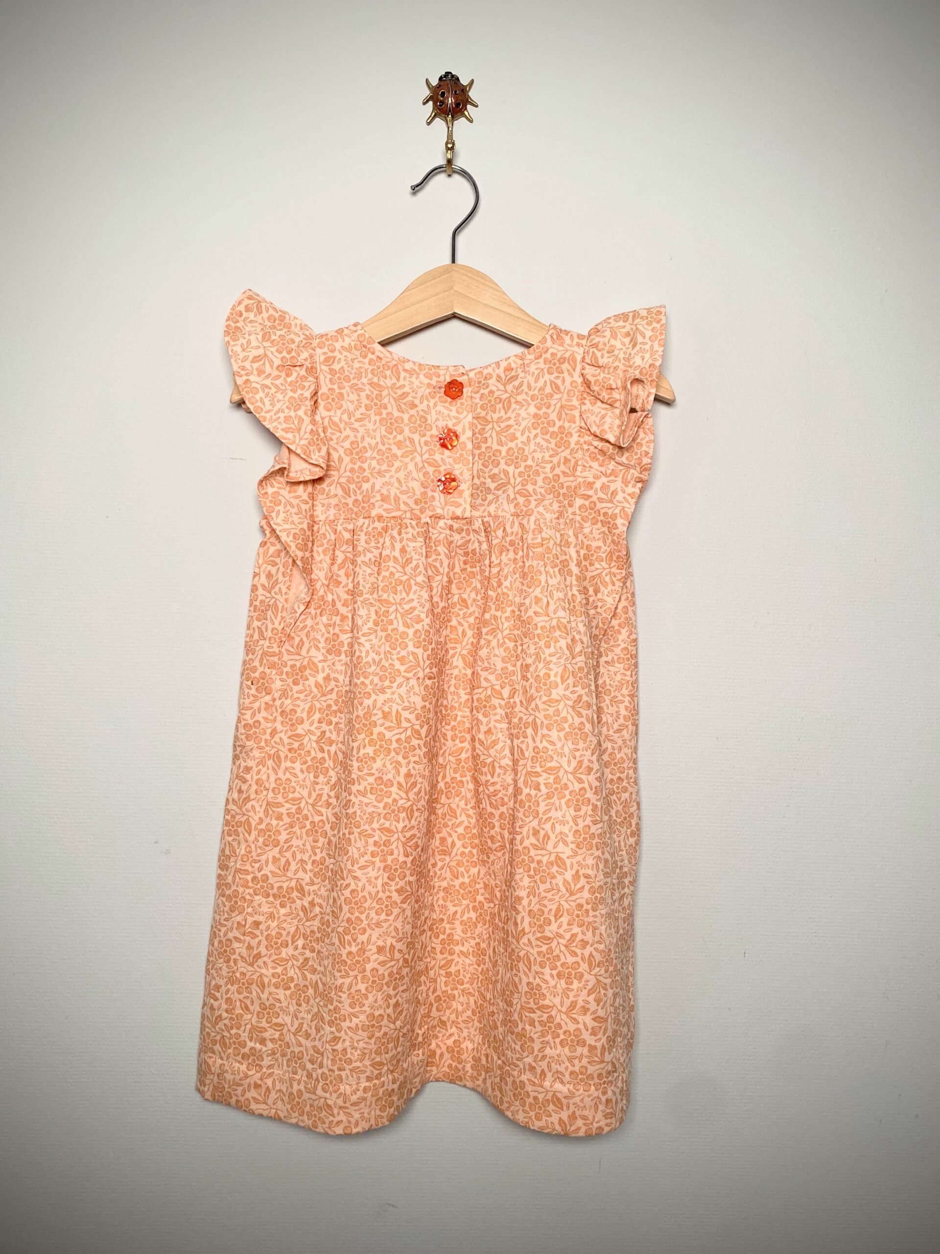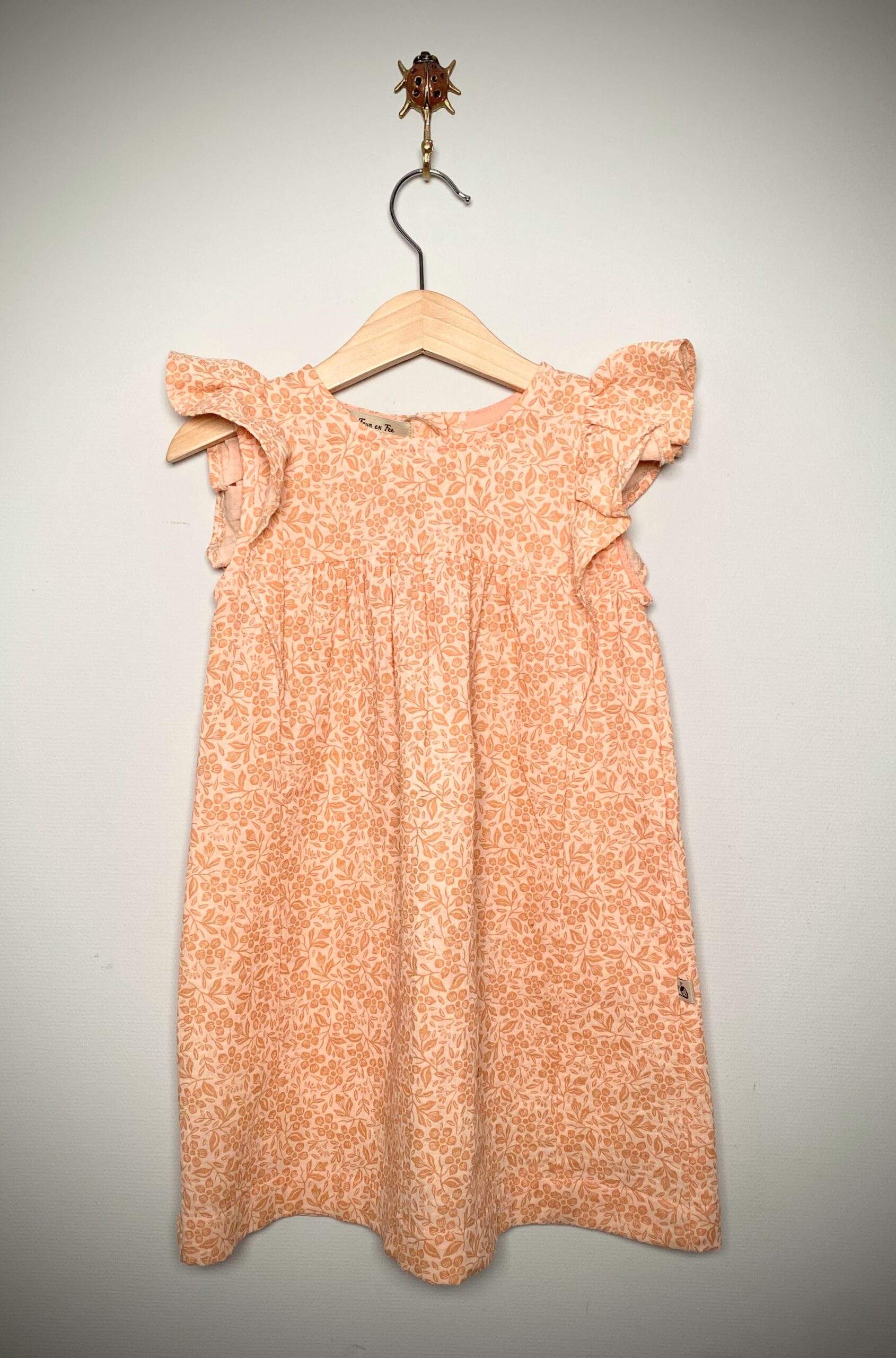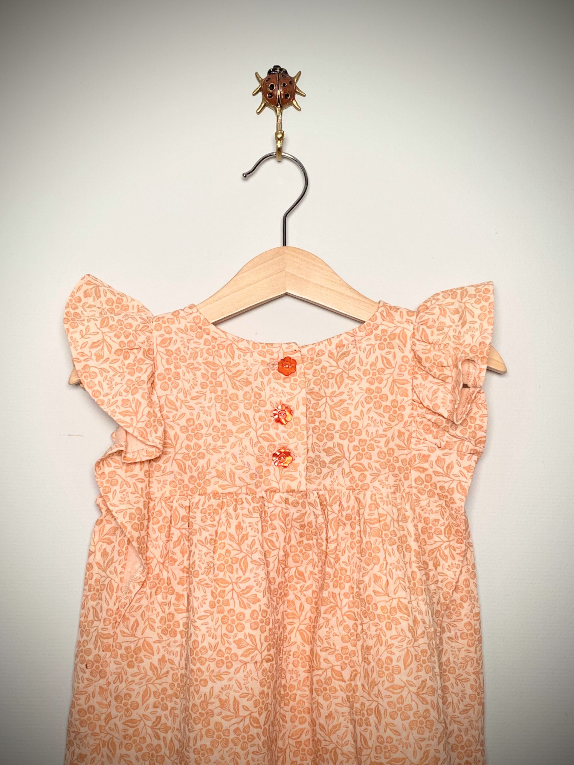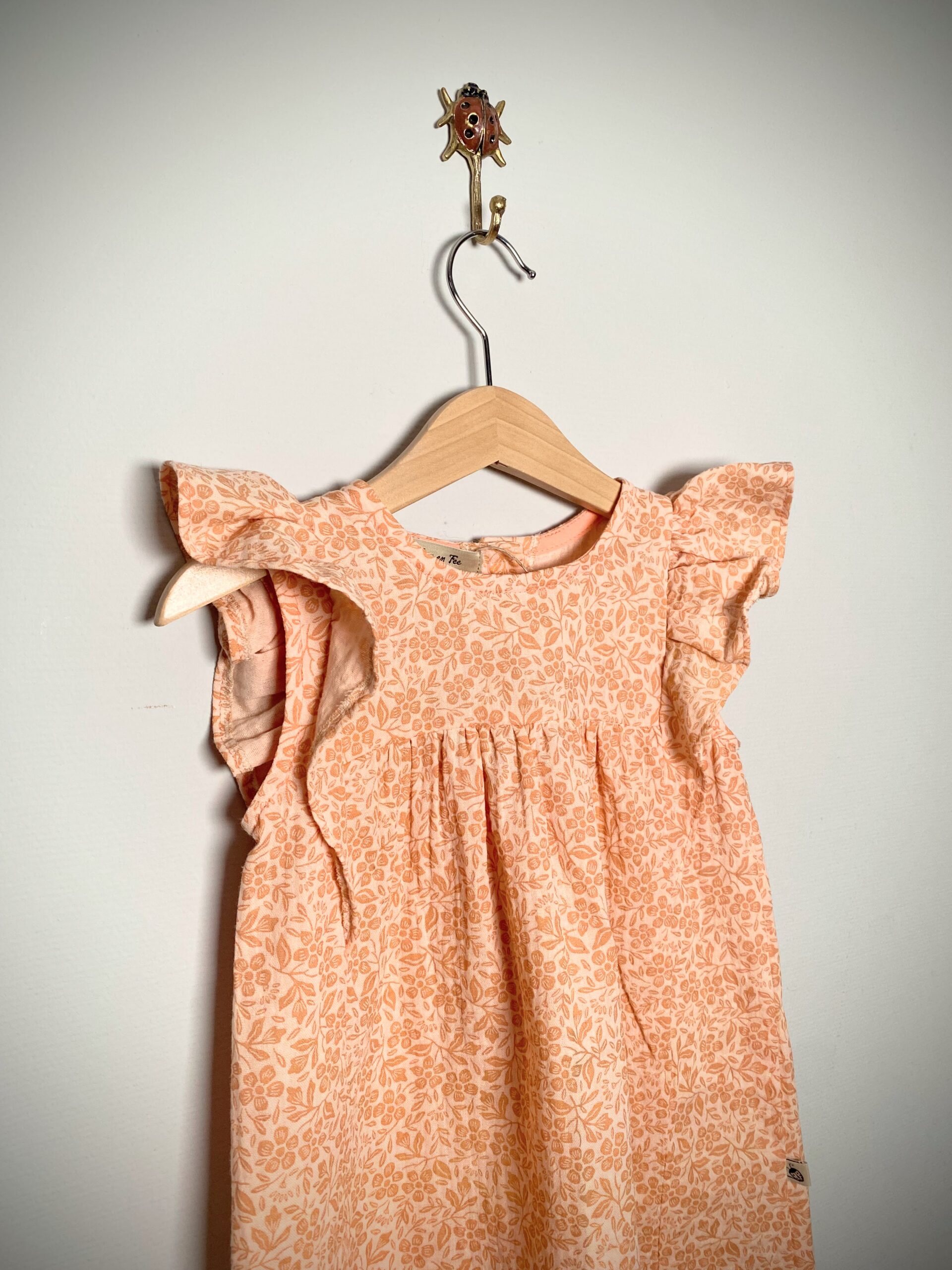 Een zacht en luchtig jurkje in een warme perzikkleur met fijne bloemenprint. De speelse mouwtjes en de losse comfortabele snit maken dit jurkje perfect voor zonnige dagen, feestjes of gewoon om heerlijk in te spelen.